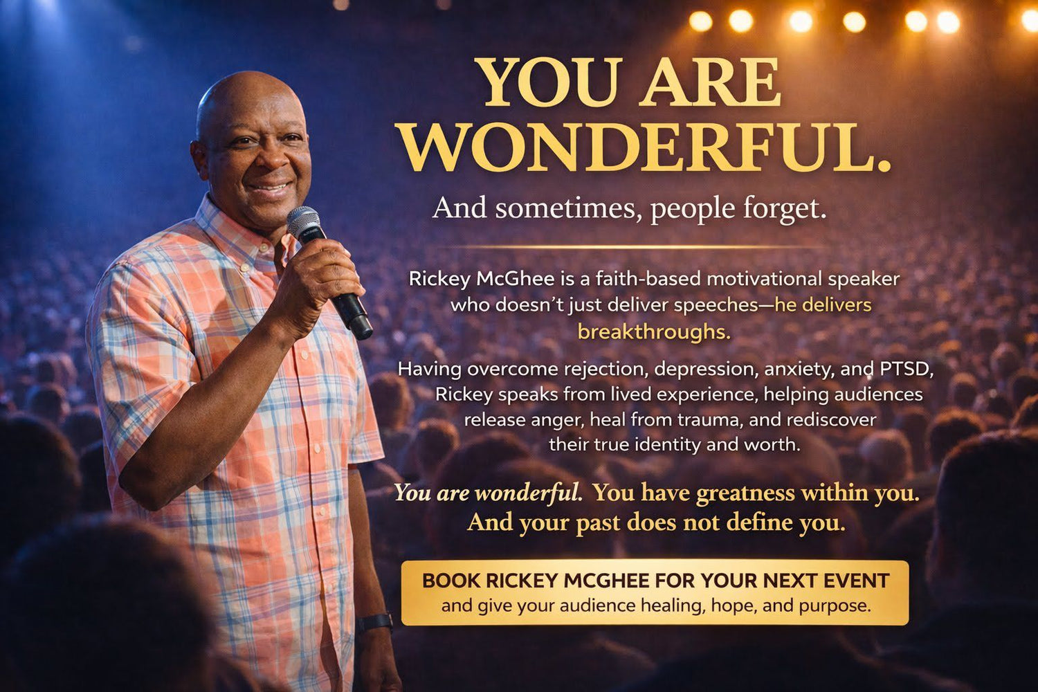 I deliver powerful, faith-based motivational talks for individuals, groups, organizations, and special events. My speaking style is uplifting, heartfelt, and focused on helping people discover the truth about who they are and the great future ahead of them.